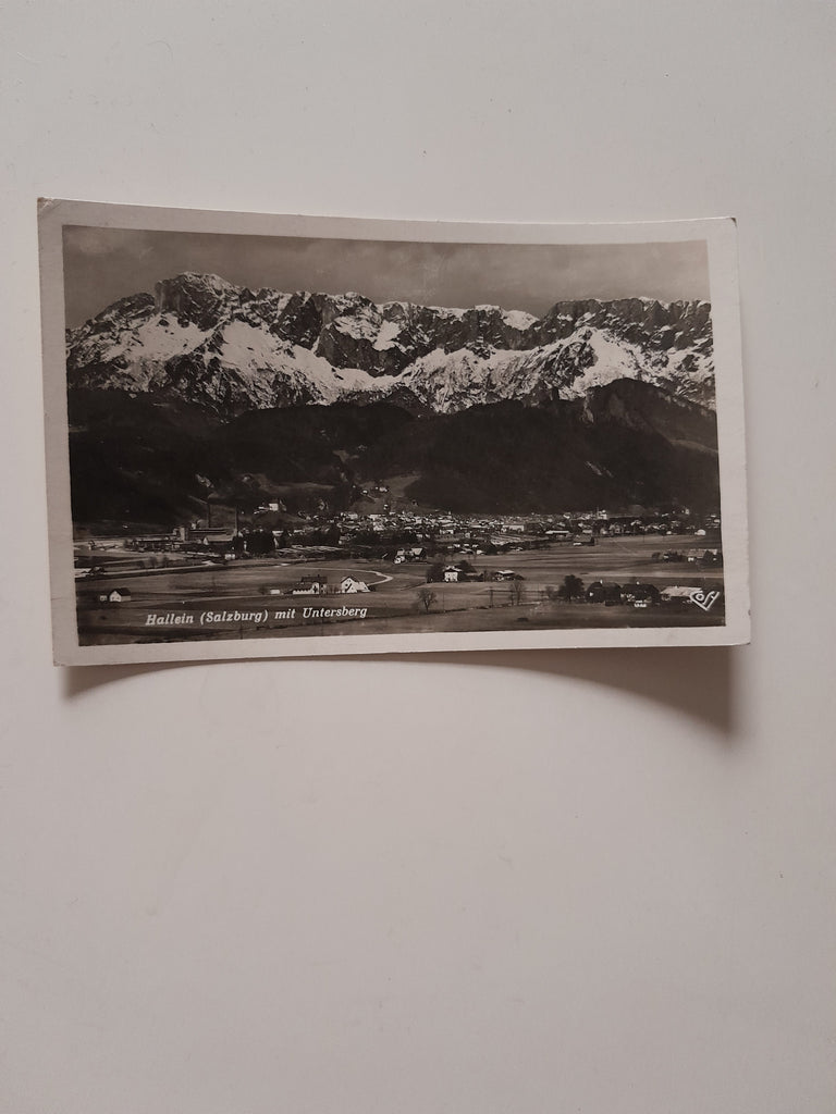 AK Hallein mit Untersberg. Gelaufen. Kleinformat. Verlag: Cosy. Nummeriert: 620. Zustand: gut, linkes oberes Eck angeknickt.