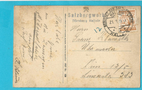 AK Hallein und Dürrnberg. (1927) Gelaufen. Kleinformat. Verlag: Huttegger. Nummeriert: 528. Zustand: Ecken etwas angestoßen.