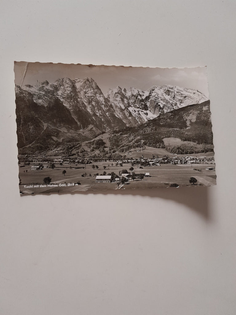 AK Kuchl mit dem Hohen Göll. Gelaufen. Kleinformat. Jurischek. Nummeriert: 10. Zustand: linkes oberes und rechtes unteres Eck geknickt.