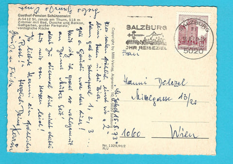 AK St. Jakob am Thurn. Gasthof-Pension Schützenwirt. Gelaufen. Großformat. Verlag: MM. Nummeriert: 1325/H/2. Zustand: gut, rechtes oberes Eck angeknickt.