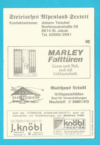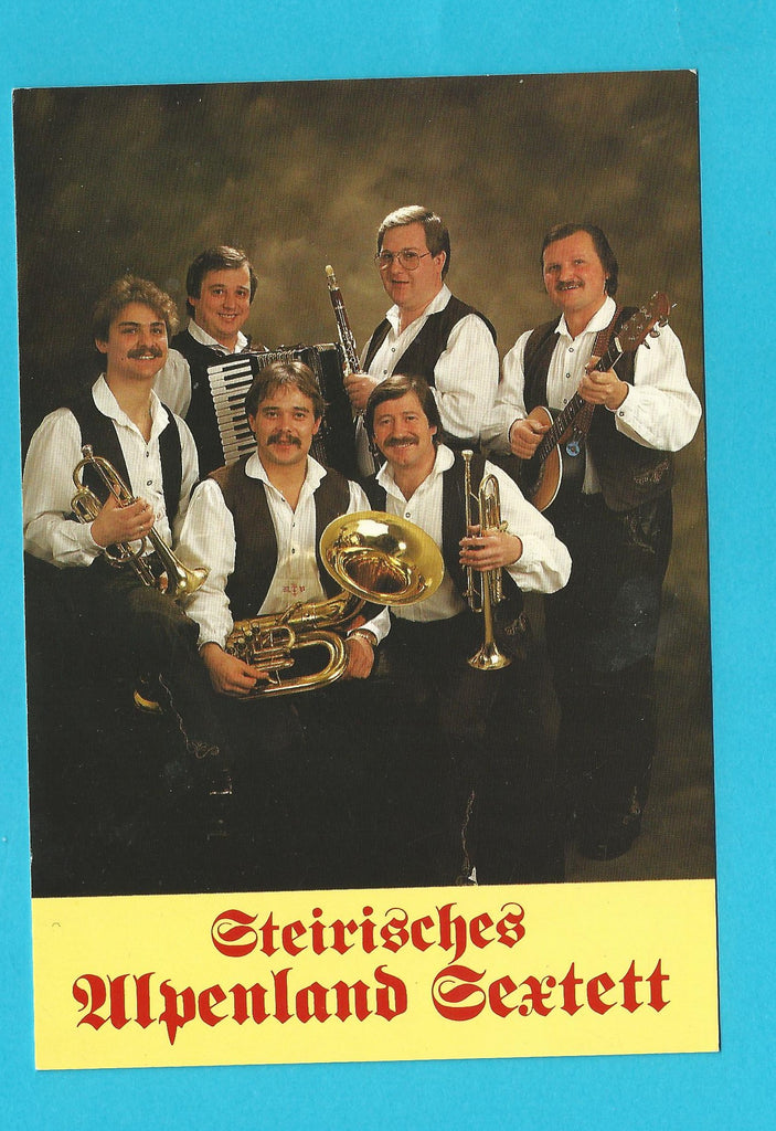 Autogrammkarte Steirisches Alpenland Sextett. Kontaktadresse: Johann Teischel Breitenauerstraße 58 St. Jakob. Großformat. Verlag: Vogrin. Zustand: gut, leicht fleckig.