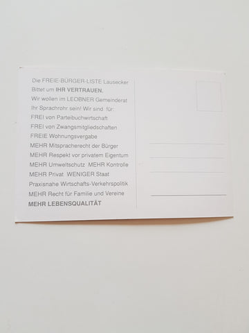 Wahlwerbe-Karte Freie Bürgerliste Lausecker FBLL für Leoben. Ungelaufen. Großformat. Zustand: gut.