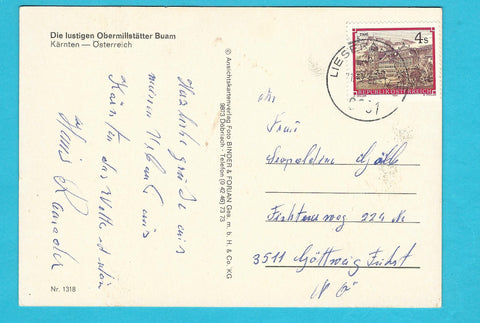 AK Die lustigen Obermillstätter Buam. Gelaufen. Großformat. Verlag: Binder & Forjan. Nummeriert: 1318. Zustand: Knick am oberen Rand.