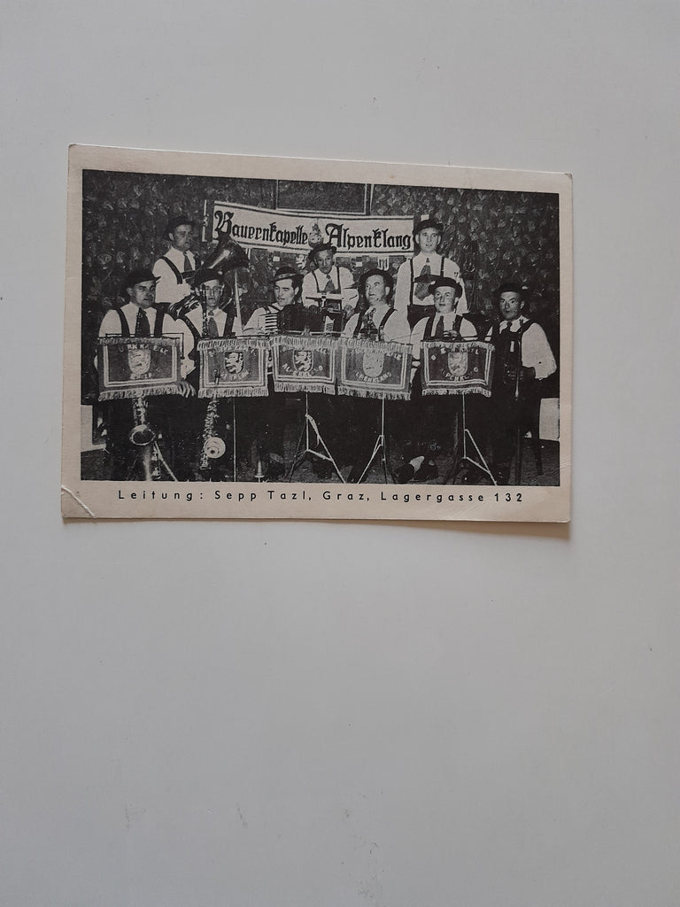 Autogrammkarte Bauernkapelle Alpenklang. Leitung: Sepp Tazl, Graz, Lagergasse 132. Großformat. Zustand: gut, rechtes unteres Eck geknickt.