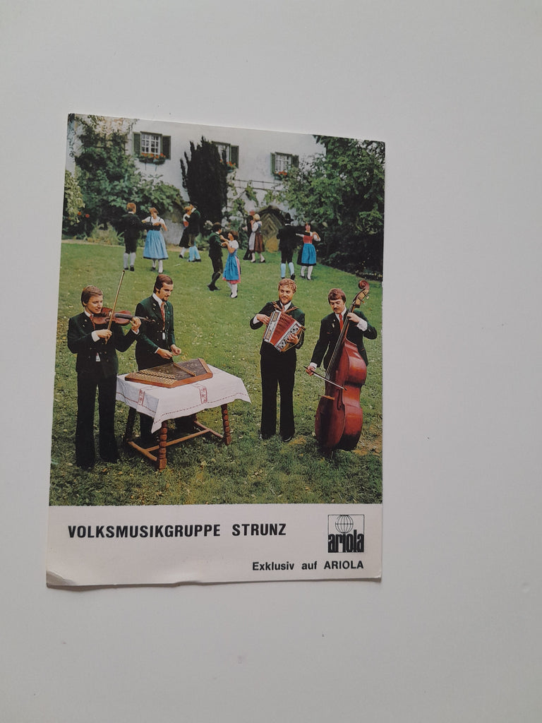 Autogrammkarte Volksgruppe Strunz. Bad Gams. Großformat. Zustand: rechtes oberes und linkes unteres Eck geknickt, Stecknadeldurchstich oben.
