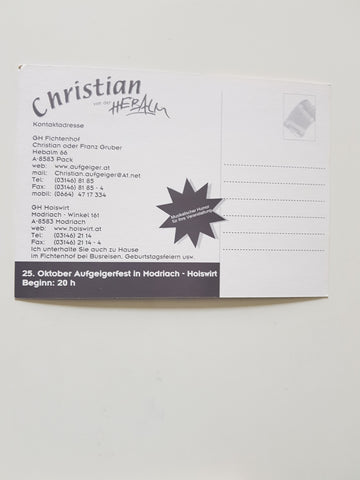 Autogrammkarte Christian von der Hebalm. GH Fichtenhof, Hebalm 66, Pack, GH Hoiswirt, Modriach-Winkel 161. Ungelaufen. Großformat. Zustand: gut.