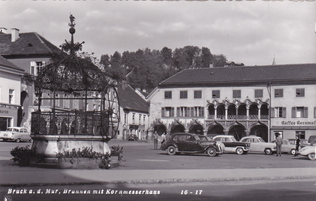 AK Bruck an der Mur. Brunnen mit Kornmesserhaus. Ungelaufen. Kleinformat. Verlag: Glantschnigg. Nummeriert: 16-17. Zustand: gut.
