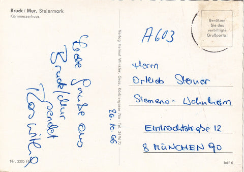 AK Bruck an der Mur. Kornmesserhaus. Gelaufen, Briefmarke wurde entfernt. Großformat. Verlag: Winkler. Nummeriert: 3305 FG. Zustand: gut, leicht bestoßen.