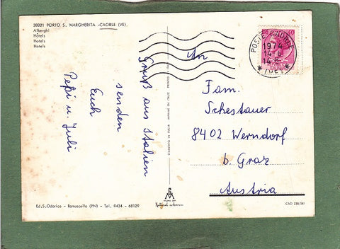 AK Caorle. Porto S. Margherita. Alberghi. Gelaufen 1974. Großformat. Verlag: Odorico. Nummeriert: 238/381. Zustand: stofffleckig und stärker bestoßen.