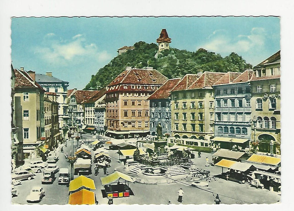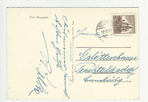 AK Graz, Hauptplatz. (1962) Gelaufen. Großformat. Verlag: Knollmüller. Nummeriert: 501-952. Zustand: rechtes unteres Eck geknickt, Oberfläche leicht knittrig.