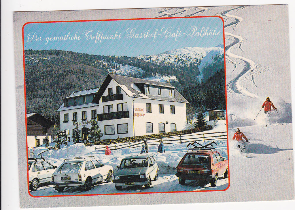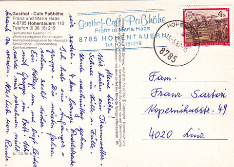 AK Hohentauern 110. Gasthof Cafe Paßhöhe. Franz und Maria Haas. (1985) Gelaufen 1987. Großformat. Verlag: Hruby. Nummeriert: 9016. Zustand: gut, Ecken und am Rand leicht bestoßen.