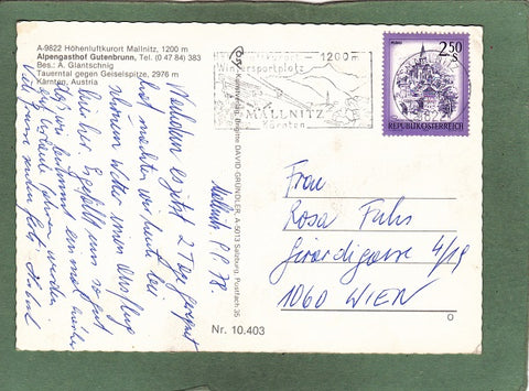 AK Mallnitz Alpengasthof Gutenbrunn. Bes. A. Glantschnig. Gelaufen 1978. Großformat. Verlag: Cosy. Nummeriert: 10.403. Zustand: gut, linke Ecken angeknickt.