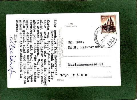 AK Mitterndorf. Pension Ezelsdorfer. (Tischlerei, Möbelhaus). Gelaufen 1968 in Mitterndorf, Karte des Besitzers an Urlaubsgast mit Schreibmaschine geschrieben und signiert Ezelsdorfer. Kleinformat. Verlag: Kain. Zustand: gut.