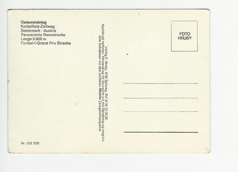 AK Österreichring. Grand Prix Formel 1. Knittelfeld-Zeltweg. Ungelaufen. Großformat. Verlag: Hruby. Nummeriert: 7370. Zustand: linkes unteres Eck geknickt, andere Ecken angeknickt.