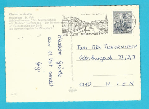 AK St. Veit an der Glan. Schüsselbrunnen. Gelaufen. Großformat. Verlag: Steinmann. Nummeriert: 971. Zustand: gut, linkes unteres Eck geknickt.