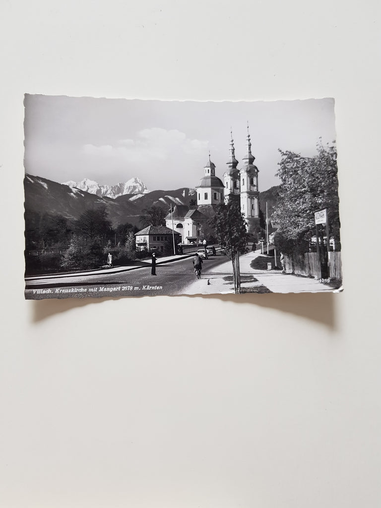 AK Villach. Kreuzkirche mit Mangart. Gelaufen. Kleinformat. Verlag: Schilcher. Nummeriert: 1259. Zustand: rechte Ecken geknickt.