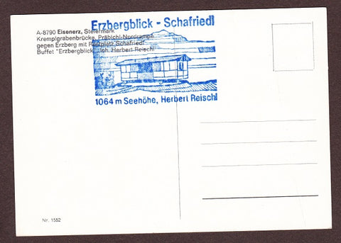 AK Eisenerz. Kremplgrabenbrücke, Präbichl-Nordrampe gegen Erzberg mit Rastplatz Schafriedl. Buffet Erzbergblick Inh. Herbert Reischl. Ungelaufen. Großformat. Zustand: gut.