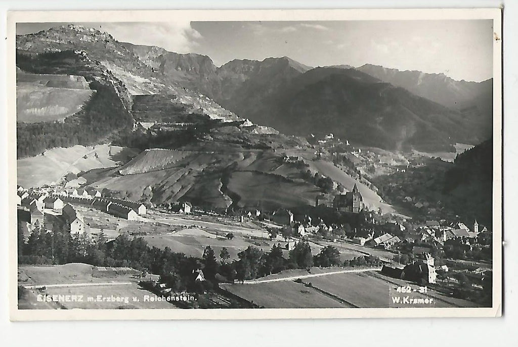 AK Eisenerz mit Erzberg u. Reichenstein. Ungelaufen. Kleinformat. Verlag: Kramer. Nummeriert: 452-31. Zustand: stärker bestoßen, fleckig, Kleberückstände auf Rückseite.