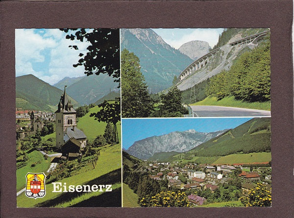 AK Eisenerz. Schichtturm gegen neue Präbichl-Nordrampe Stadtteil Münichtal mit Seemauer. Ungelaufen. Großformat. Verlag: Alpenland. Nummeriert: 1195. Zustand: gut.