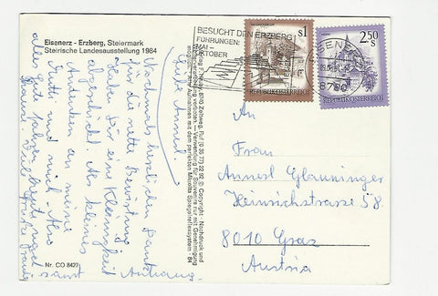 AK Erz und Eisen. Eisenerz. Steirische Landesausstellung 1984. (1984) Gelaufen. Großformat. Verlag: Hruby. Nummeriert: 8427. Zustand: gut, rechtes oberes Eck geknickt.