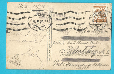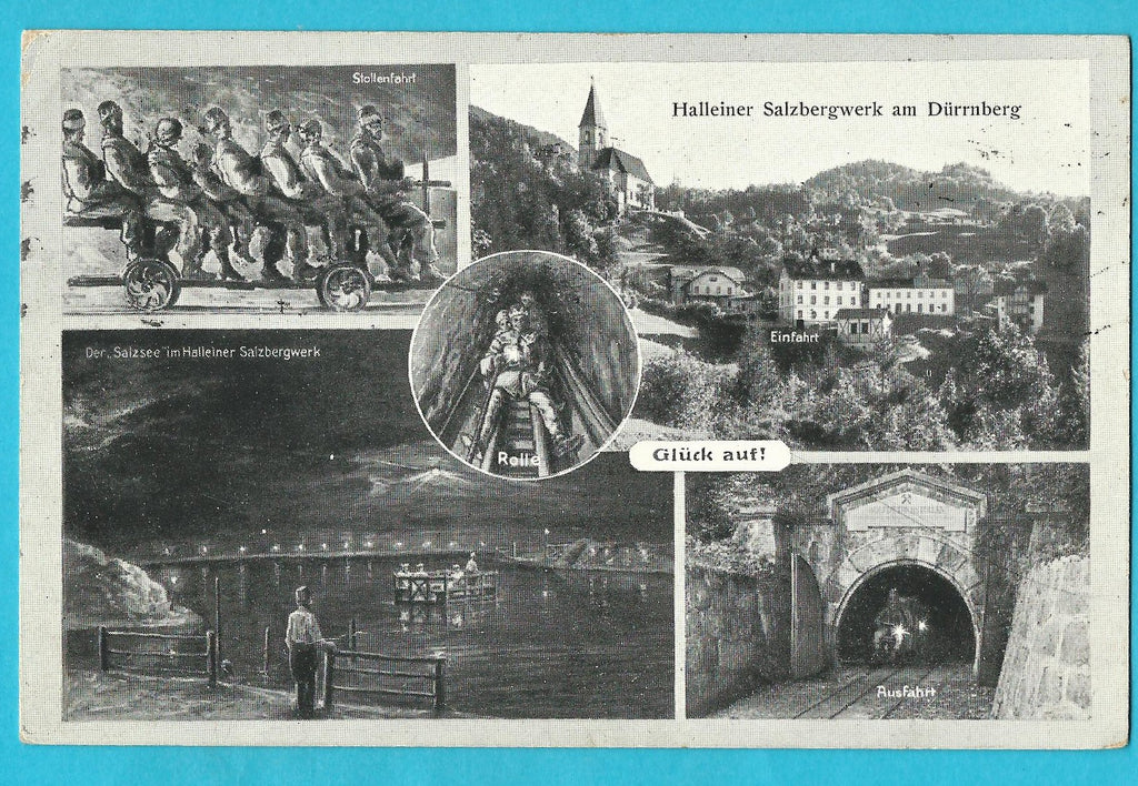 AK Halleiner Salzbergwerk am Dürrnberg. (1928) Gelaufen. Kleinformat. Verlag: Huttegger. Nummeriert: 617. Zustand: linkes oberes Eck und über dem linken unteren Bild geknickt.