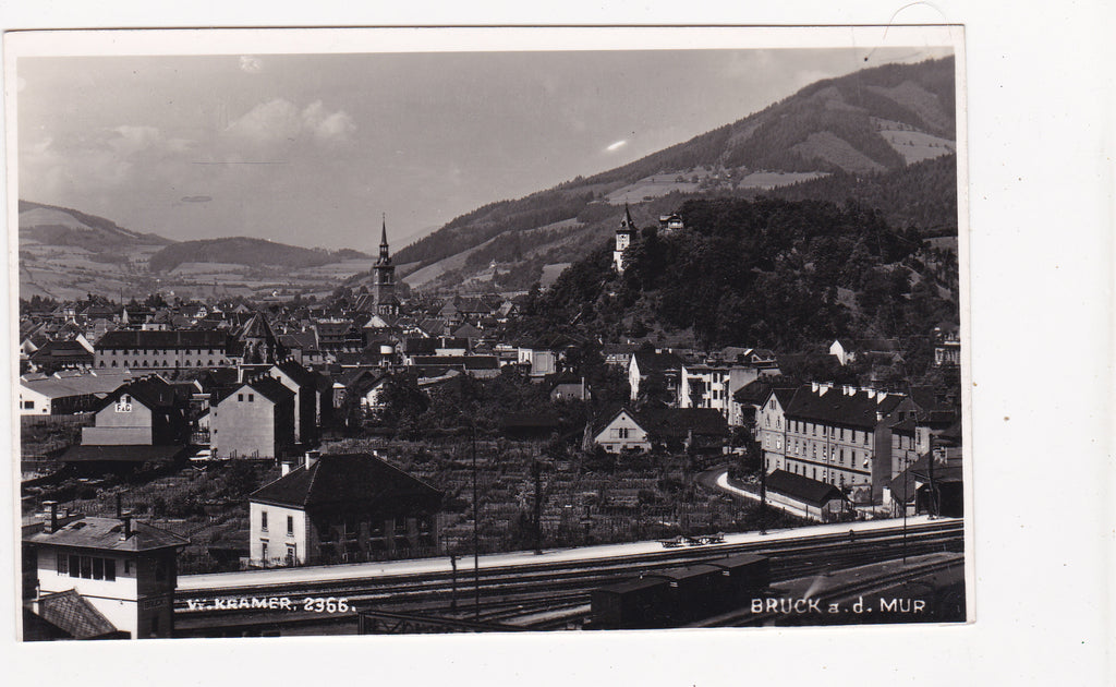 AK Bruck an der Mur. Ungelaufen. Kleinformat. Verlag: Kramer. Nummeriert: 2366. Zustand: Produktionsfehler, schlechte Belichtung, unregelmäßig aus Bogen geschnitten, sonst O.k. im Vordergrund Bahnstrecke.