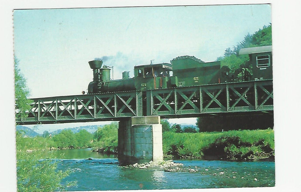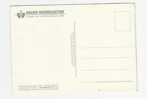 AK Köflacher Bahn auf der Kainach-Brücke bei Krottendorf. Landesausstellung 1988 Glas + Kohle Bärnbach. Ungelaufen. Aufnahme: Dr. Eberhard Franz. Druck: Zimmermann-Druck. Großformat. Zustand: Knick am rechten Rand in der unteren Hälfte, leicht fleckig.