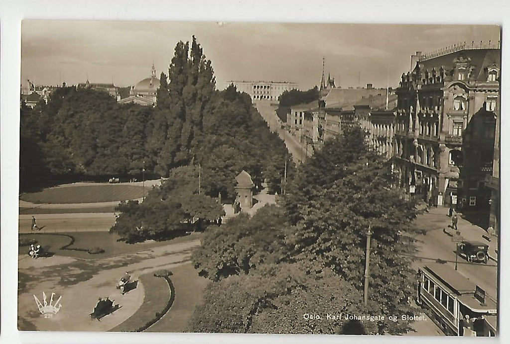AK Oslo. Karl Johansgate og Slottet. Ungelaufen. Kleinformat. Verlag: Abel's. Nummeriert: 221. Zustand: gut., am oberen Rand leicht bestoßen.