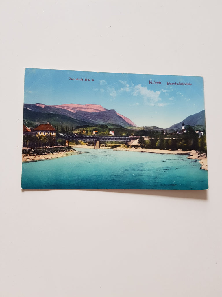 AK Villach. Eisenbahnbrücke. (1913) Ungelaufen. Kleinformat. Verlag: Bogensberger. Nummeriert: 3117. Zustand: gut, Ecken mit leichten Steckalbumdruckspuren.
