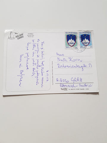 AK Pozdrav iz Slovenije. Gelaufen. Neues Großformat. linkes unteres und rechtes oberes Eck geknickt.