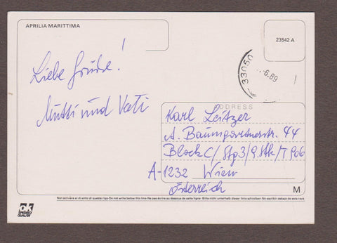 AK Aprilia Marittima. Gelaufen 1989, aber Briefmarke wurde entfernt. Großformat. Nummeriert: 23542 A. Zustand: obere Ecken angeknickt.