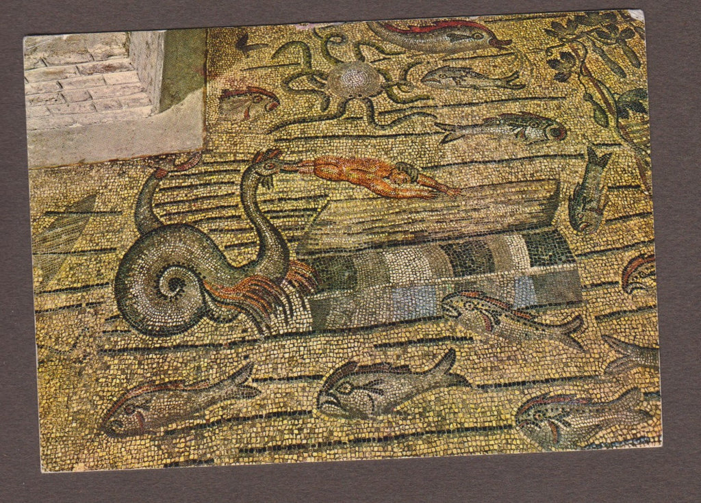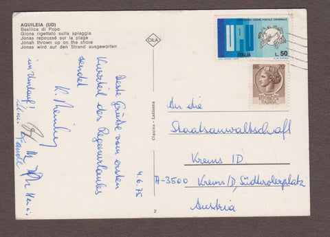 AK Aquileia. Basilica di Popo. Giona rigettato sulla spiaggia. Gelaufen 1975. Großformat. Verlag: Cigaina. Nummeriert: 2. Zustand: Ecken angeknickt.
