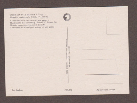 AK Aquileia. Basilica di Poppo. Mosaico pavimentale (iniz del IV sec.) Esorcismo musivo unico nel suo genere. Ungelaufen. Großformat. Verlag: Pro Basilica. Foto Ghedina. Nummeriert: 329.115. Zustand: gut.