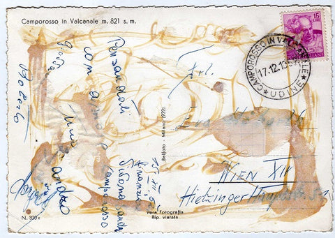 AK Camporosso Dintorni. Albergo Bellavista. Monte Lussari. Via Val Canale.  Gelaufen 1962 in Camporosso. Verlag: Belfoto Milano. Nummeriert: 320x. Zustand: war in ein Album eingeklebt, starke Klebespuren auf Rückseite, rechtes unteres Eck geknickt, mehre Knicke, andere Ecken leicht angeknickt.