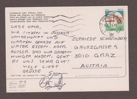 AK Cividale del Friuli. Ponte del Diavolo sul Natisone. Gelaufen 1995. Großformat. Verlag: Lamarca. Nummeriert: 71/52. Zustand: rechts oben etwas fettfleckig, sonst leichte Läsuren.