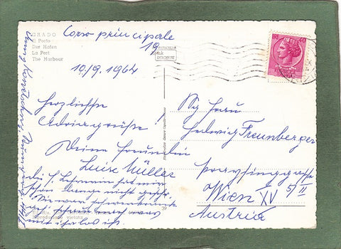 AK Grado. Il Porto. Gelaufen 1964. Großformat. Verlag: Moro Giovanni. Nummeriert: 39. Zustand: rechtes unteres Eck mehrfach geknickt, am linken Rand oben Einriss ca. 5mm.