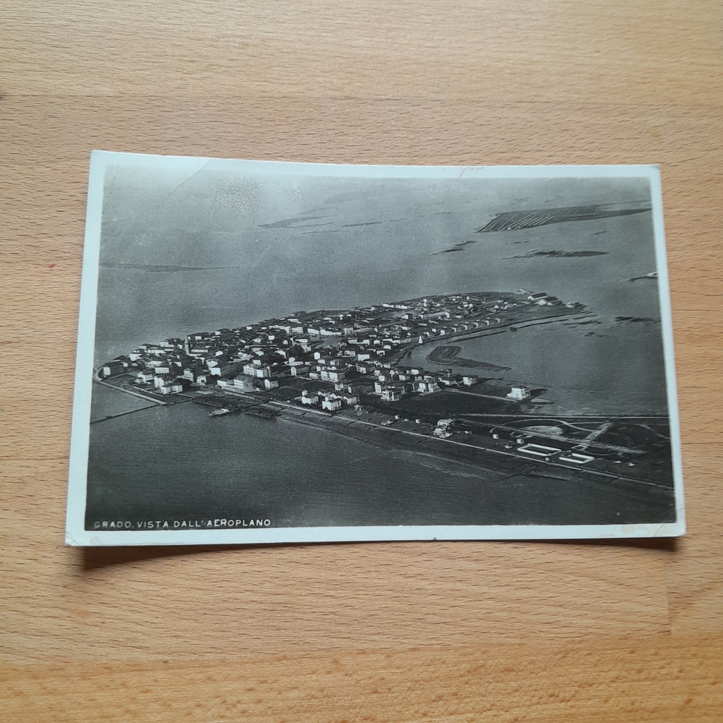 AK Grado Vista dall'aereoplano. Gelaufen, aber Briefmarke wurde entfernt. Kleinformat. Zustand: Knick am oberen Rand, rechtes unteres Eck geknickt.