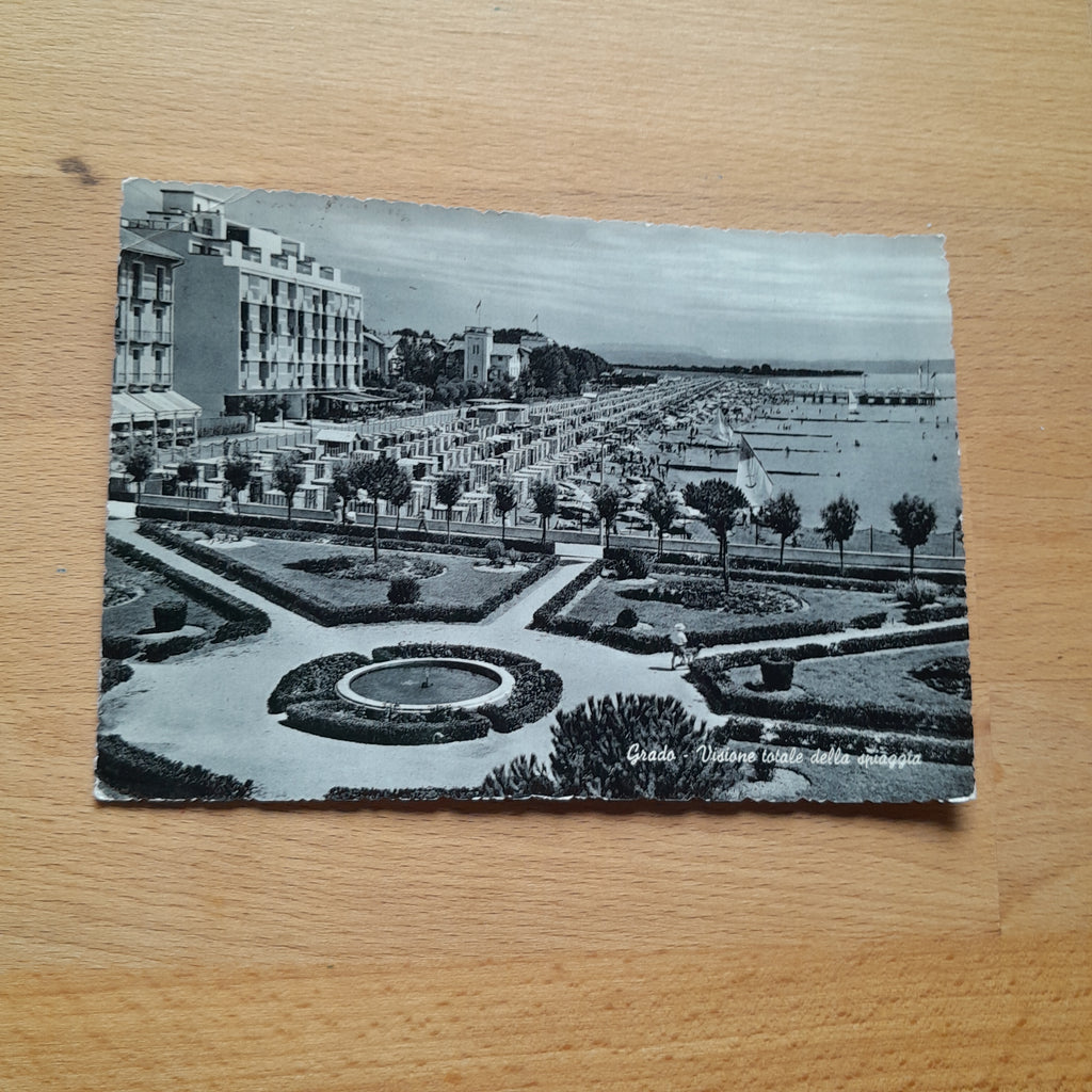 AK Grado. Visione totale della spiaggia. Gelaufen. Großformat. Zustand: linke Ecken geknickt.