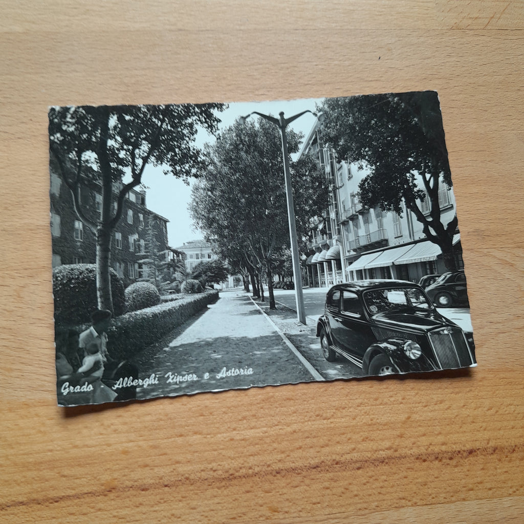AK Grado – Alberghi Zipser e Astoria. Gelaufen, aber Briefmarke wurde entfernt. Großformat. Nummeriert: 28982. Zustand: gut, leicht bestoßen.