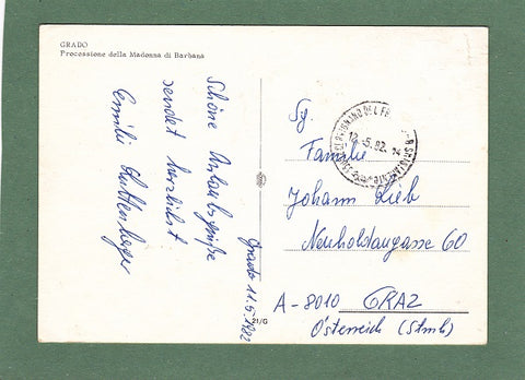 AK Grado. Processione della Madonna di Barbana. Gelaufen 1982, aber Briefmarke wurde entfernt. Großformat. Verlag: Modiano Trieste. Nummeriert: 21. Zustand: Ecken geknickt, zwei leichte Knicke etwas unterhalb des oberen Randes in der Mitte.