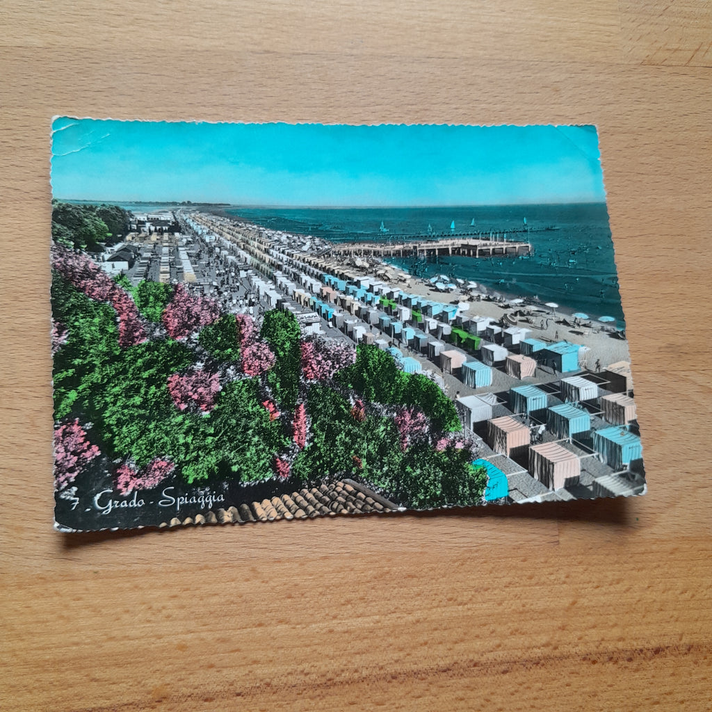 AK Grado - Spiaggia. Gelaufen, aber Briefmarke wurde entfernt. Großformat. Nummeriert: 7. Zustand: obere Ecken geknickt.
