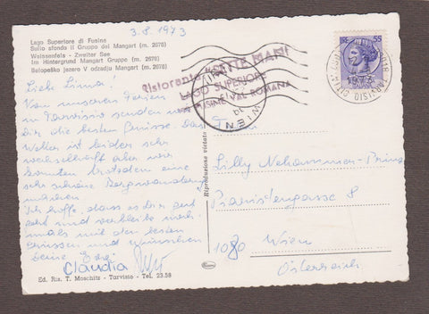 AK Lago Superiore di Fusine. Sullo sfondo il Gruppo del Mangart. Gelaufen 1973. Großformat. Verlag: Moschitz. Zustand: Ecken leicht angeknickt bzw. angestoßen, sonst O.k.