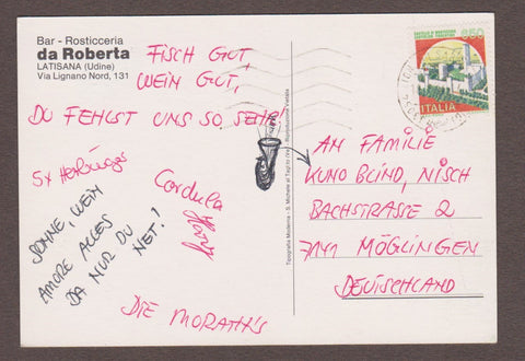 AK Latisana, Via Lignano Nord 131. Bar Rosticceria Da Roberta. Gelaufen. Großformat. Verlag: Tipografia Moderna. Zustand: gut, linkes unteres Eck angeknickt.