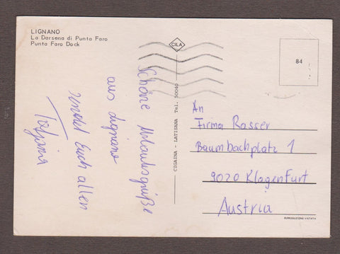 AK Lignano. Gelaufen, aber Briefmarke wurde entfernt. Großformat. Verlag: Cigaina. Nummeriert: 84. Zustand: linker Rand gewellt, linkes oberes Eck geknickt.