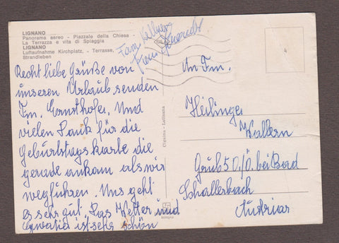 AK Lignano. Gelaufen, aber Briefmarke wurde entfernt. Großformat. Verlag: Cigaina. Nummeriert: 4. Zustand: linke Bildhälfte stark bestoßen.