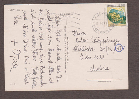 AK Lignano. Gelaufen 1989. Großformat. Verlag: De Longhi. Nummeriert: DL-5. Zustand: Knicke über den oberen Bildern.