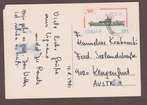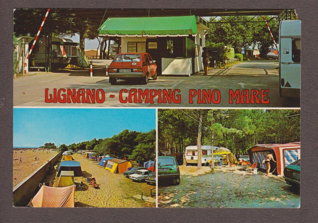 AK Lignano - Camping Pino Mare. Gelaufen 1981. Großformat. Zustand: vom rechten oberen Eck ein Stück weggerissen, sonst O.k.
