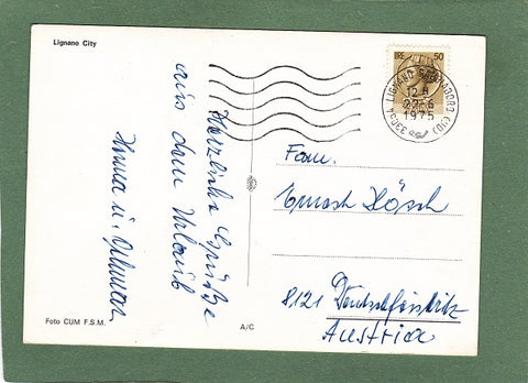 AK Lignano City. Gelaufen 1975 in Lignano Sabbiadoro. Großformat. Verlag: CUM F.S.M. Zustand: Ecken etwas angestoßen, linke Ecken leicht angeknickt, Knick am unteren Rand in der rechten Hälfte.