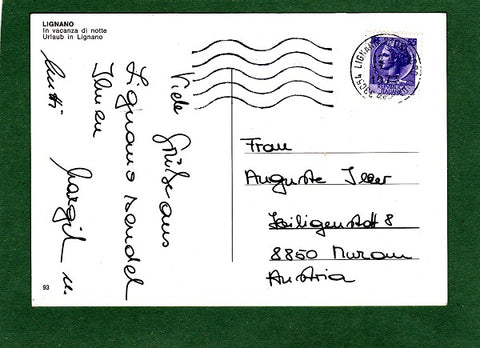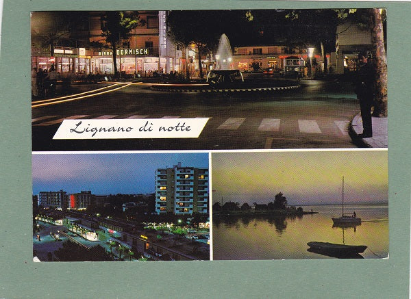 AK Lignano di Notte. Gelaufen 1973 in Lignano Sabbiadoro. Großformat. Nummeriert: 93. Zustand: Ecken etwas bestoßen, linkes oberes Eck leicht angeknickt, sonst nur geringe Randläsuren.