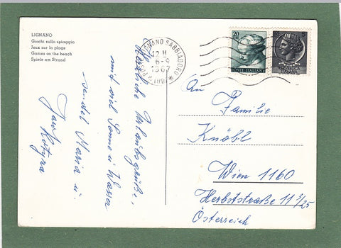 AK Lignano. Giochi sulla spiaggia. Gelaufen 1967 in Lignano Sabbiadoro. Großformat. Zustand: an Ecken etwas bestoßen, bogenförmiger Knick beim rechten Rand über dem mittleren Drittel.